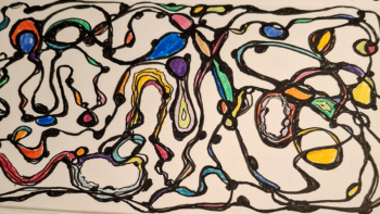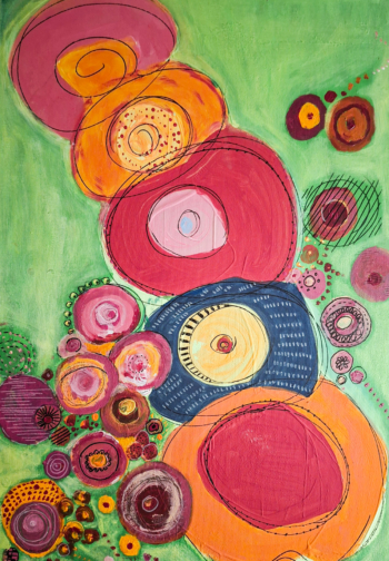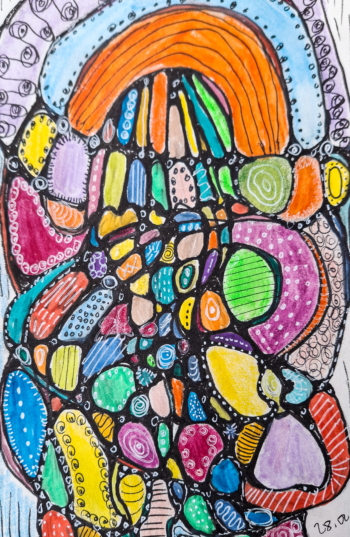 Ich male mit allen Farben, probiere mich aus. Gegenständliches wird verfremdet, neurografische Muster bringen mich zur Ruhe. Vom Innen ins Aussen. Und ich male überall. Auf der Staffelei, im Zug, in Gedanken, im Wald und im Maltagebuch. Kunst begleitet mich.